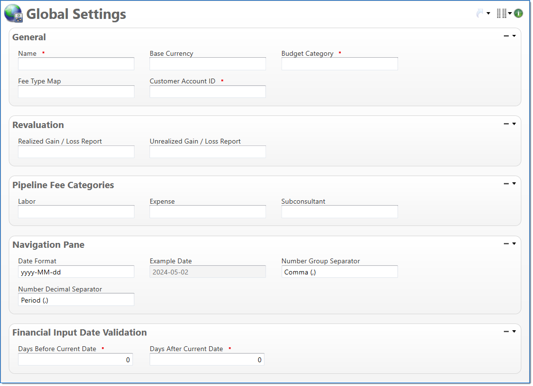 Budget Category | Select a budget category. This is the default for your environment and is used when projects have a setting that only one budget category is responsible for all the revenue. |