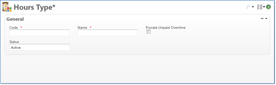The Hours Type screen allows you to add and define categories of hours. An Hours Type code is associated with charged time. This is a reporting parameter for grouping and sorting and can be reported on in the Payroll system.