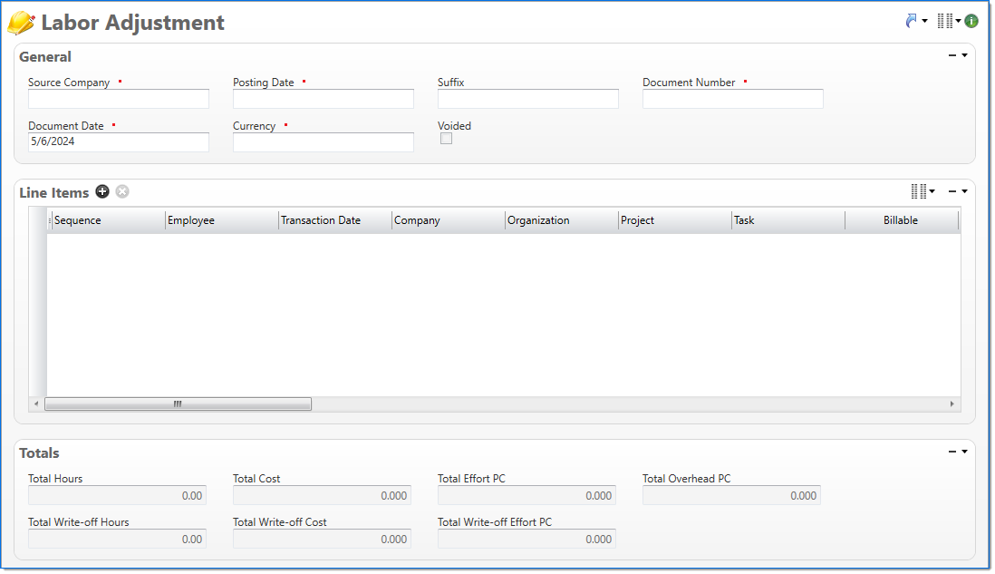 Currency | Enter or select the labor adjustment currency. If a currency is not selected, it is set to the currency of the Source Company. Only active currencies with an Effective Date that is less than or equal to the Document Date can be selected. |