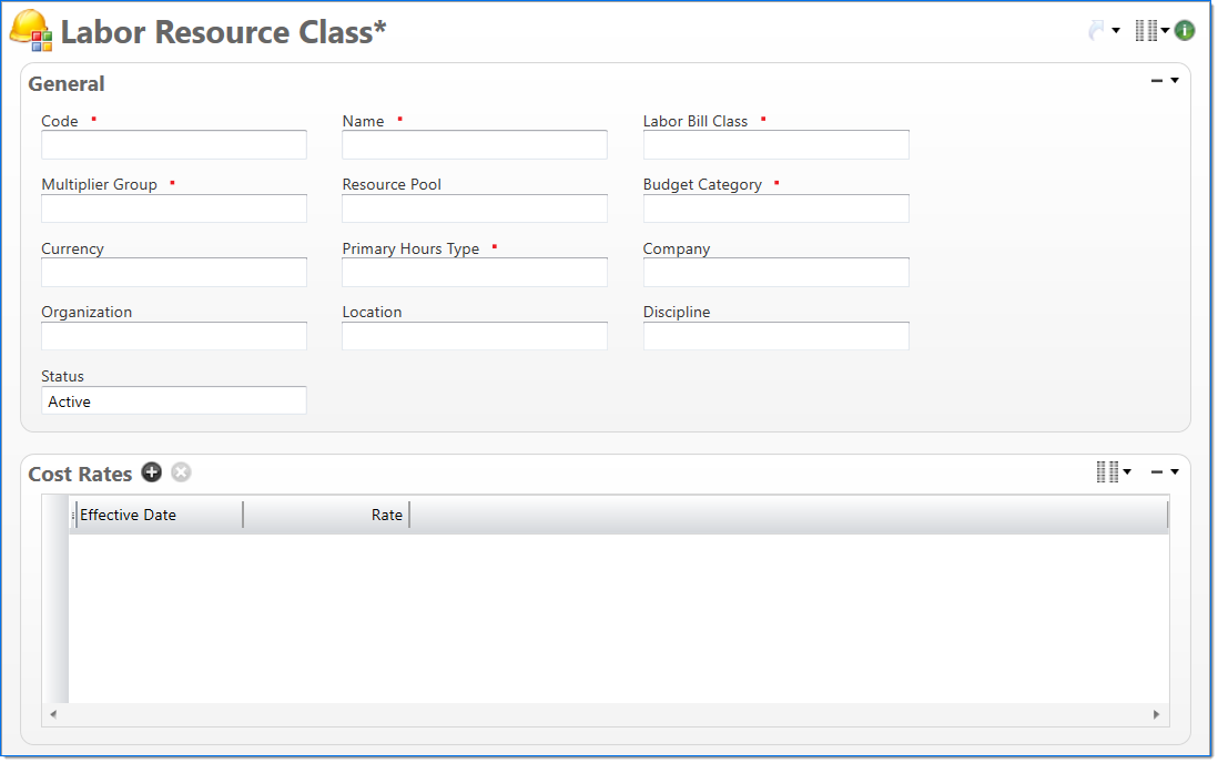 The Labor Resource Class screen allows you to add and define labor resource classes. Labor resource classes are categories used to classify employees, calculate cost and effort for planned hours, and generically plan labor hours when specific employee needs are not known. The rates associated with labor resource classes are stored by effective date.