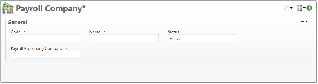 The Payroll Company screen allows you to add and define payroll companies. Payroll companies are associated with a payroll processing system and are assigned to employees to track employees in the payroll processing system.