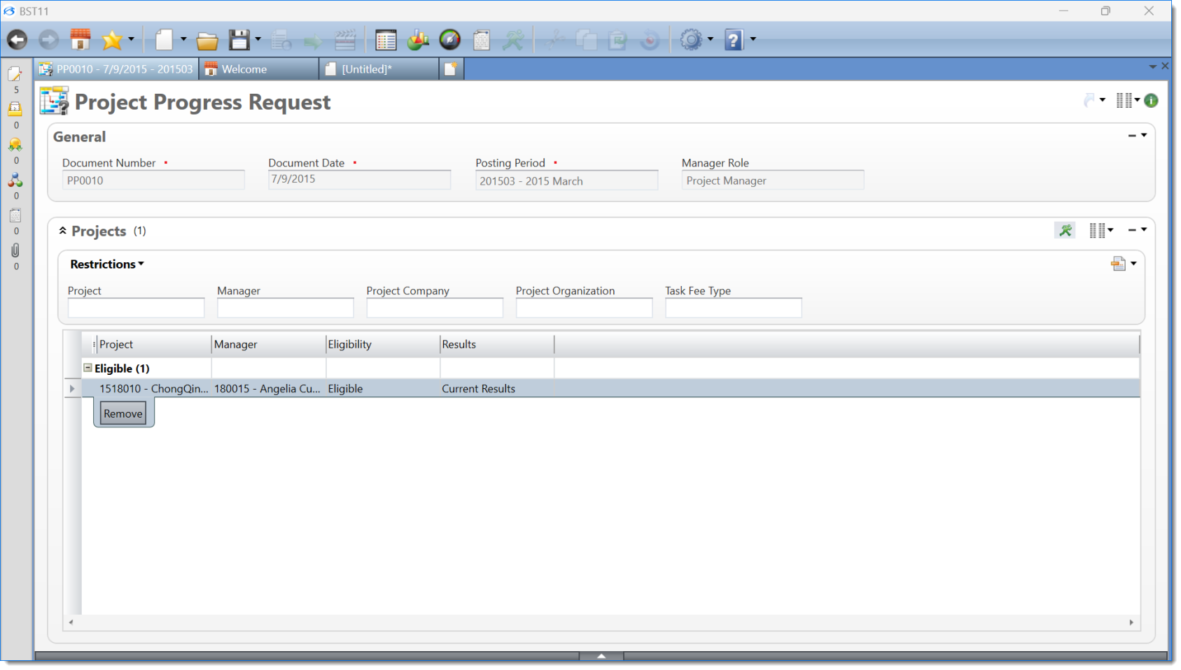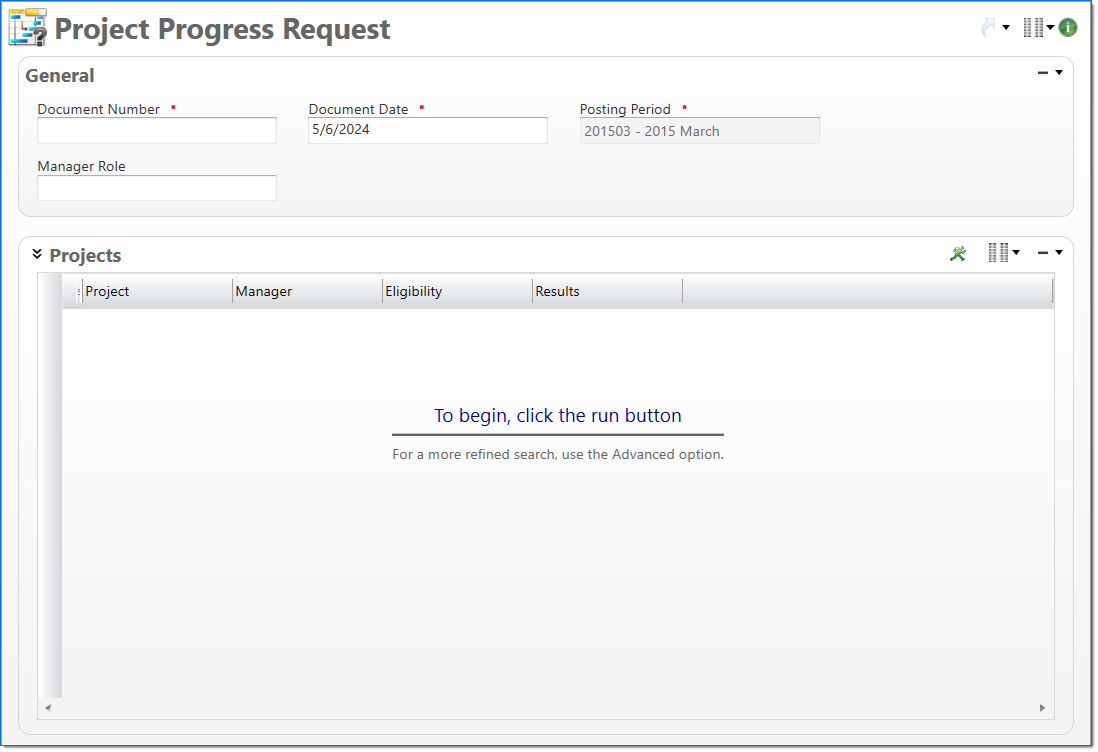 Manager Role | Select the manager role for all managers selected in the project progress request line items. Available selections include: Project Director, Project Manager (default), Task Manager, and Budget Manager. When you select a manager role, the Posting Period field automatically displays the appropriate posting period. |