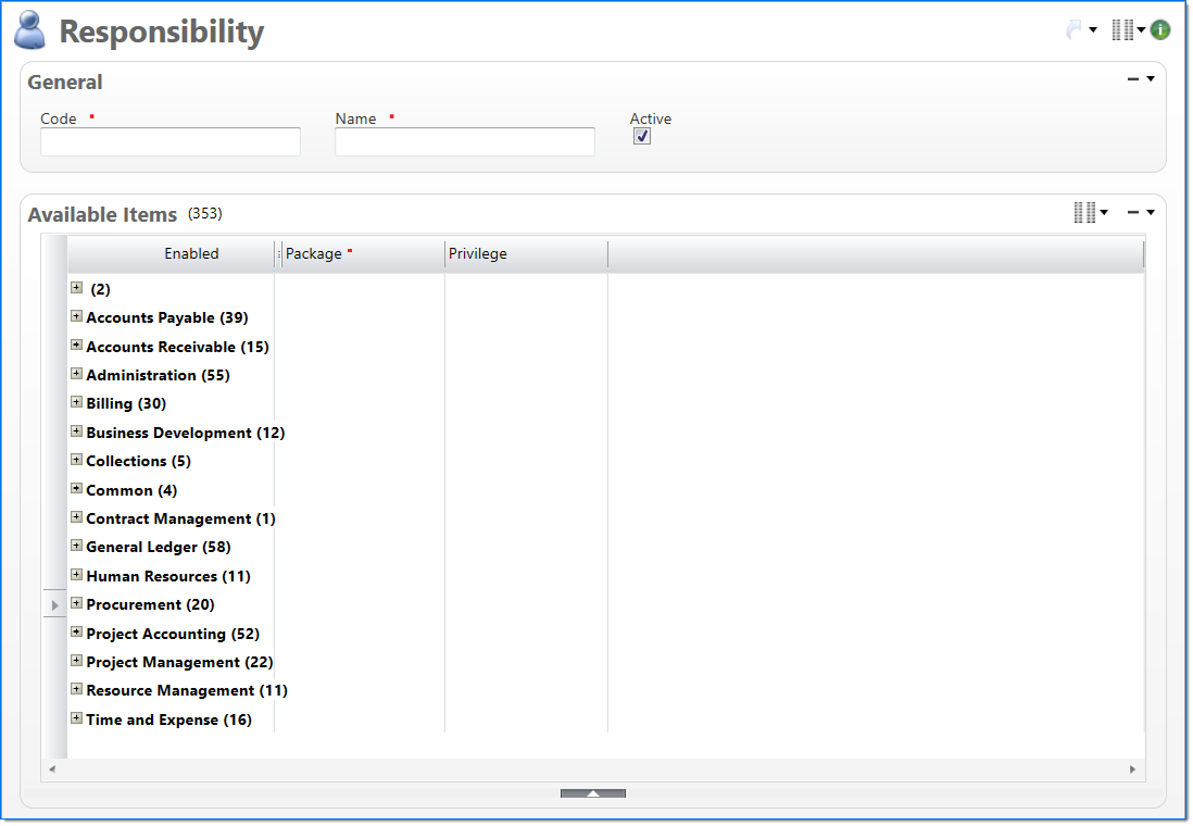 The Responsibility screen allows you to add and define responsibilities. Responsibilities are used to connect packages, privileges, and access controls and define what users and user groups can access and see in the system.