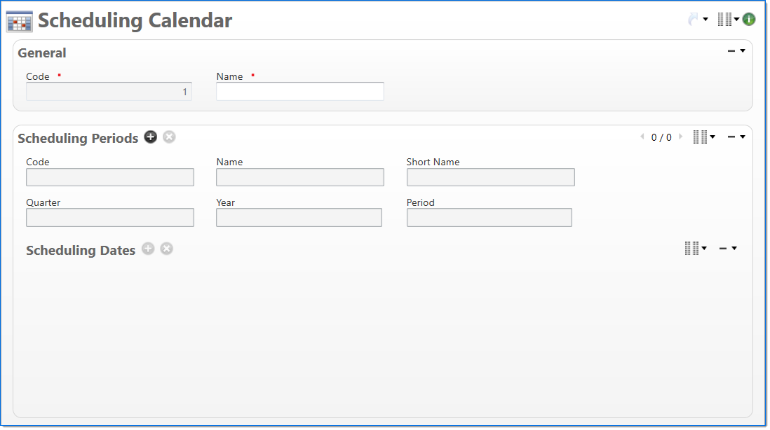 Code | Displays 1 as the default code for the scheduling calendar. This value cannot be changed. The system is limited to one scheduling calendar. |