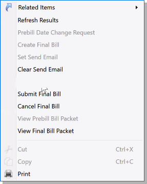 Tip: If you receive an error message when using one of the menu options, check that all conditions for that option have been met. If conditions have been met and you still get an error message, right-click to select Refresh Results, then try again. Refresh Results refreshes PreBill and Final Bill settings only. It does not refresh Project settings. |