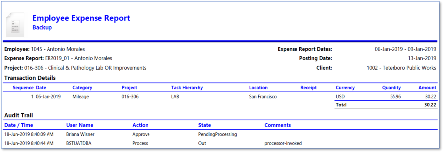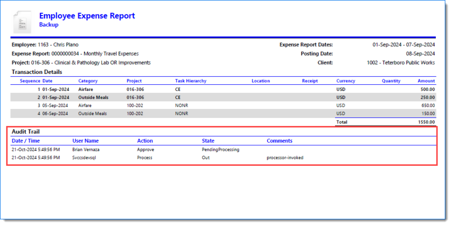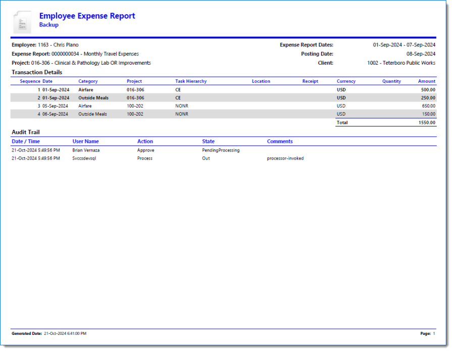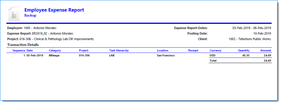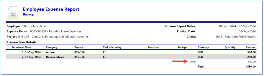 Example of Expense Report when Include Report is selected