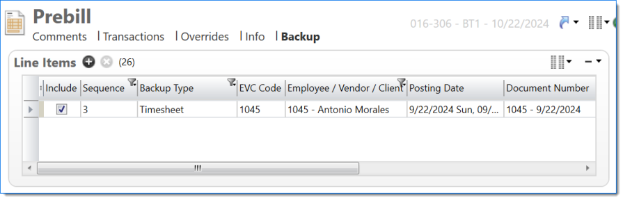 Bill Backup Style screen where Timesheets and Expense Reports are ordered by EVC Name first and then by Document Date
