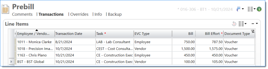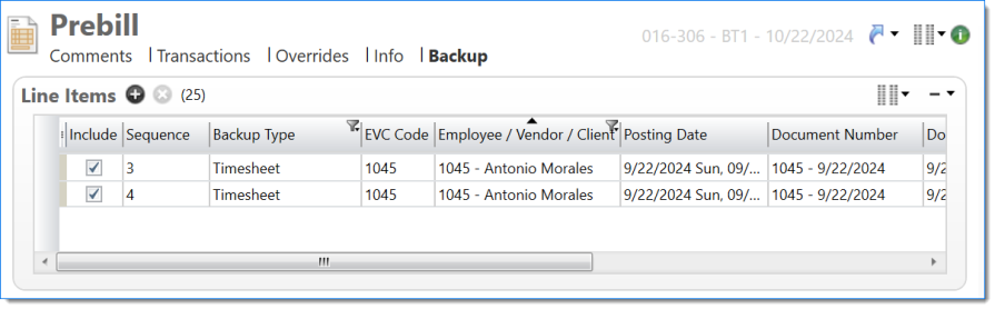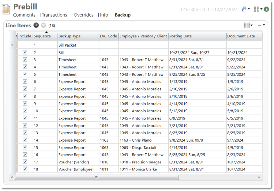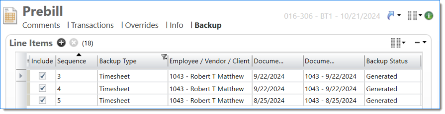 Example of Prebill Backup with one timesheet report per backup Bill Task, with transactions