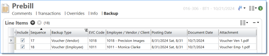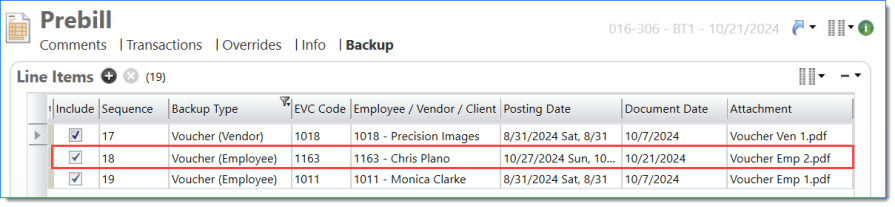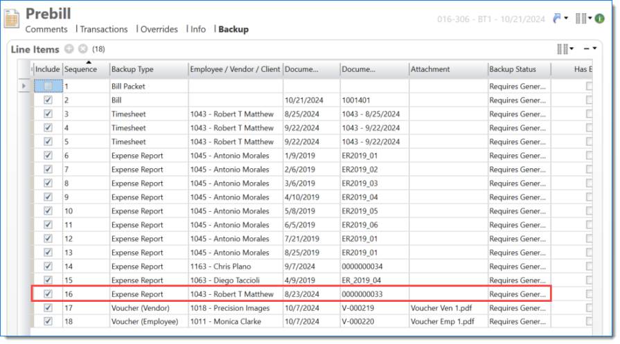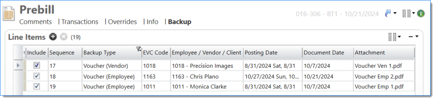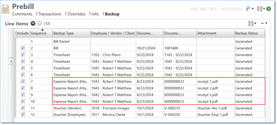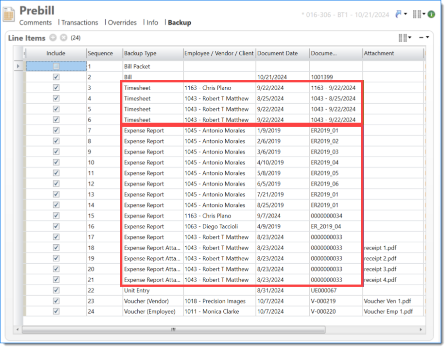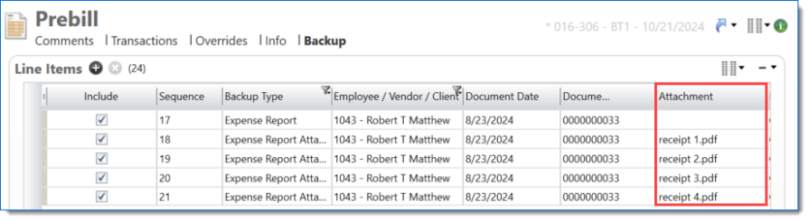 The Prebill backup displays expense reports with attachments when Include Attachments is selected